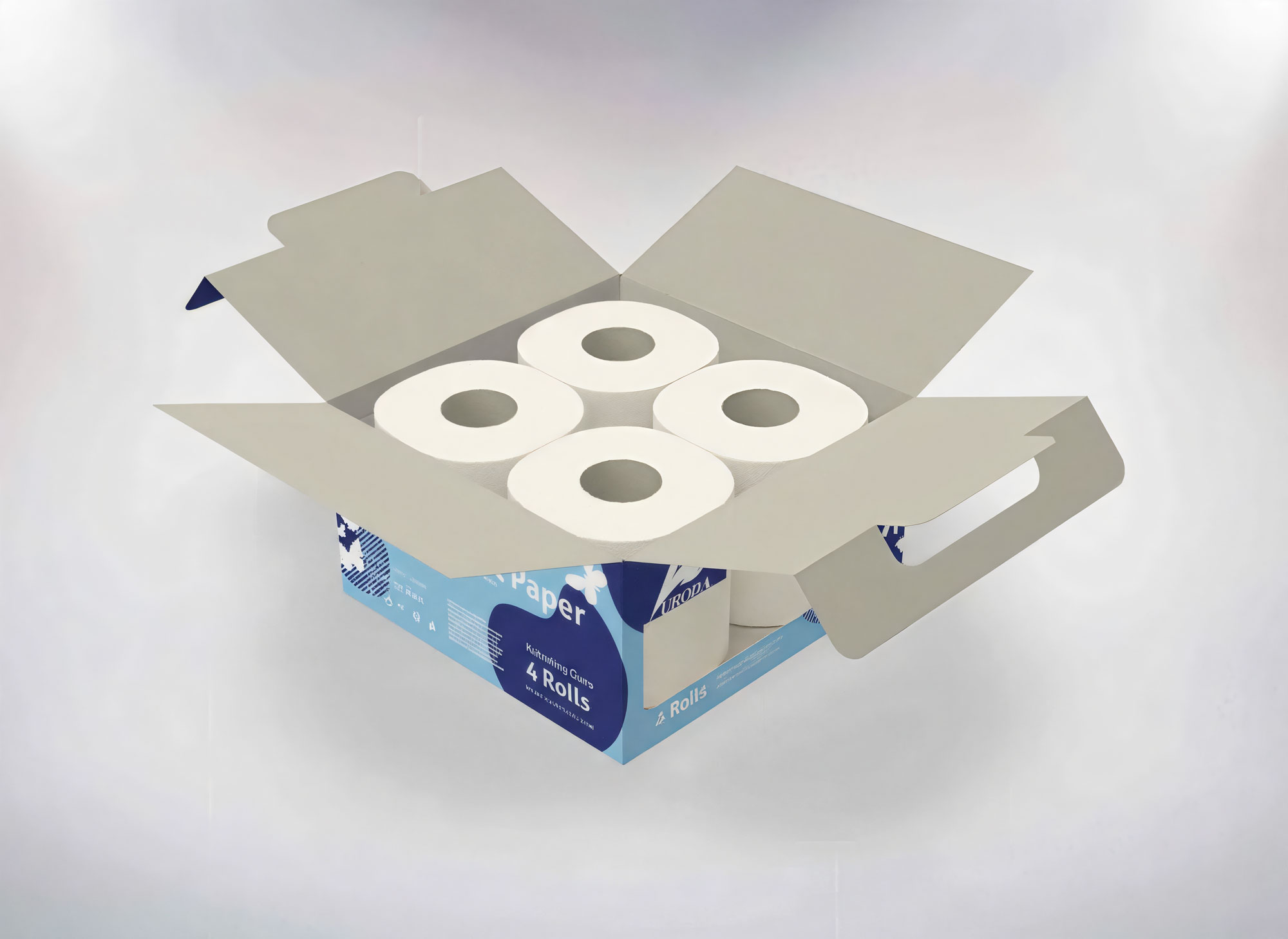 از نظر ساختاری، جعبه با هدف راحتی و دوام طراحی شده است. دسته حمل در قسمت بالای جعبه امکان جابجایی آسان چهار رول را فراهم میکند و دو پنجره جانبی نمایی از داخل جعبه ارائه میدهند تا مشتری بتواند محصول را مشاهده کند. این شفافیت حس اعتماد را افزایش داده و تجربه خرید را بهبود میبخشد.